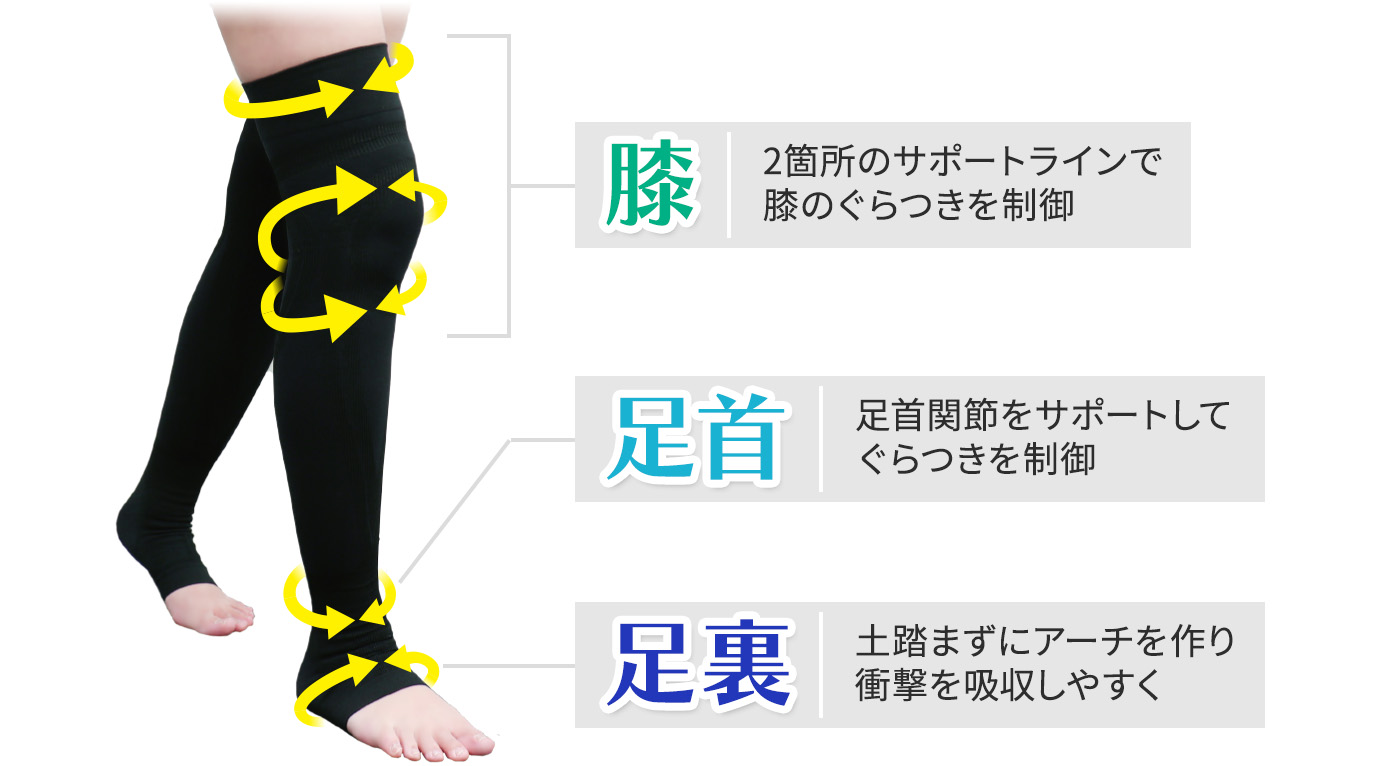 膝関節と一緒に筋肉をサポートするとグラつきにくく、足首関節を固定して足裏のアーチをつくり、正しい重心バランスに整えると、スーッとラクに歩けます。